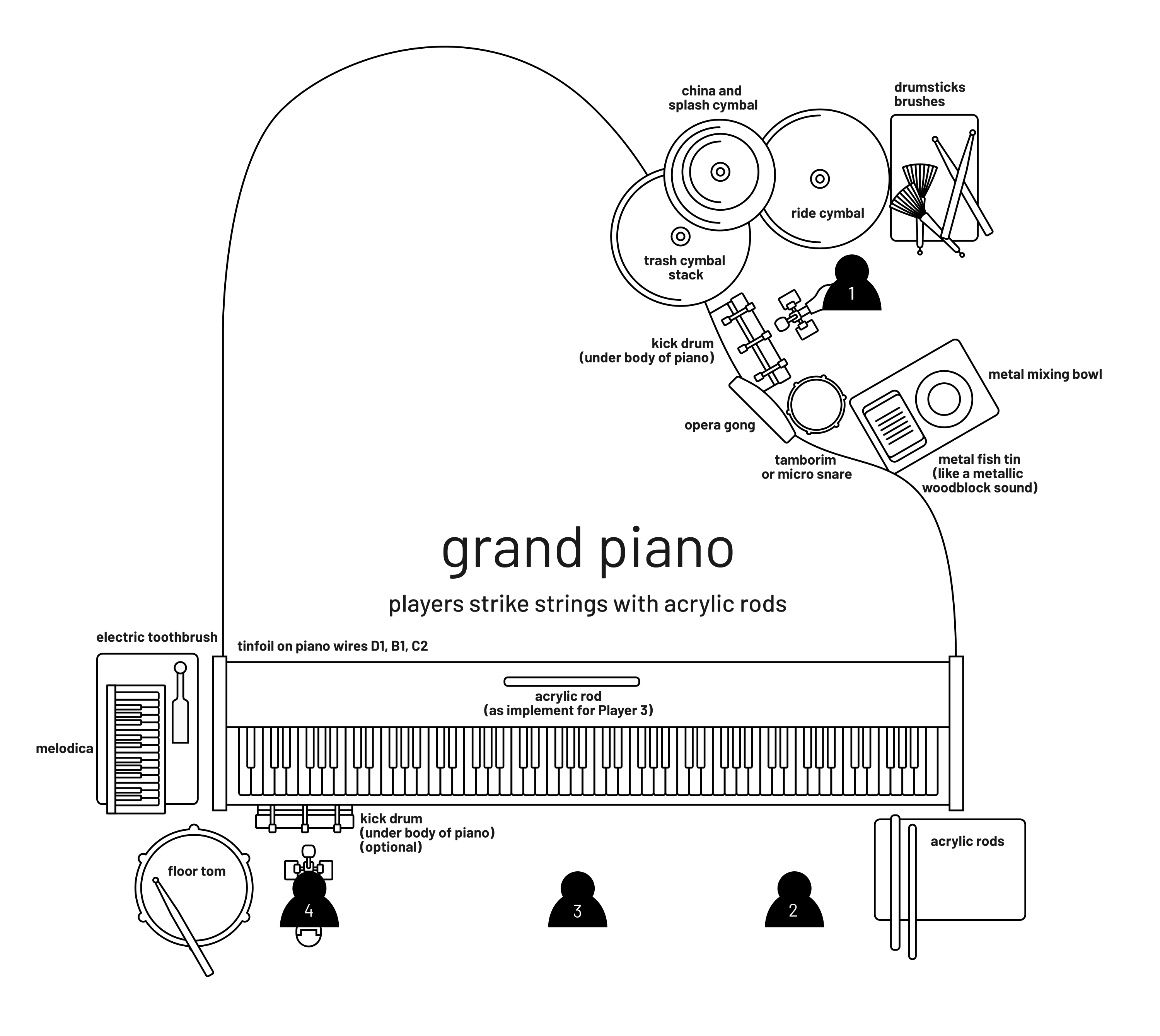The piano must have a sostenuto pedal. This work was originally written using a Steinway Model ? piano. The internal frame on other grand pianos may make some techniques difficult or render them impossible. The techniques used for piano can cause long-term damage to the piano (such as slamming the wires with sticks). If you are a student looking to perform this, ensure that you have permission to use these techniques on the piano from the owner of the piano you are using, whether that is a school owned piano or somebody else's.