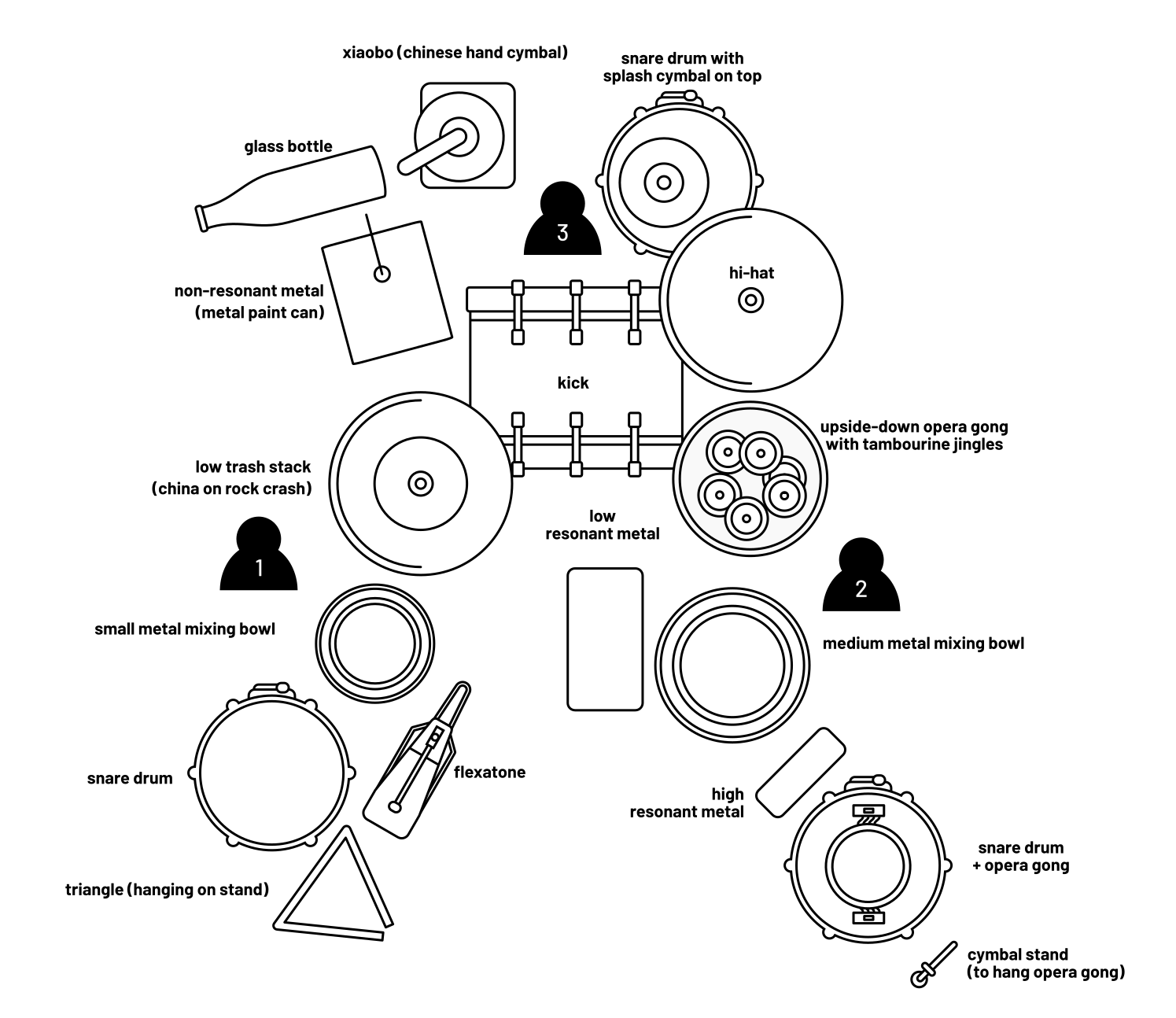 Player 3 Snare Drum (with Splash Cymbal on top) Kick Drum Hi-Hat Xiaobo (Chinese Hand Cymbal) Non-Resonant Metal (such as a metal paint can) Glass Bottle